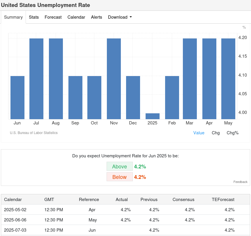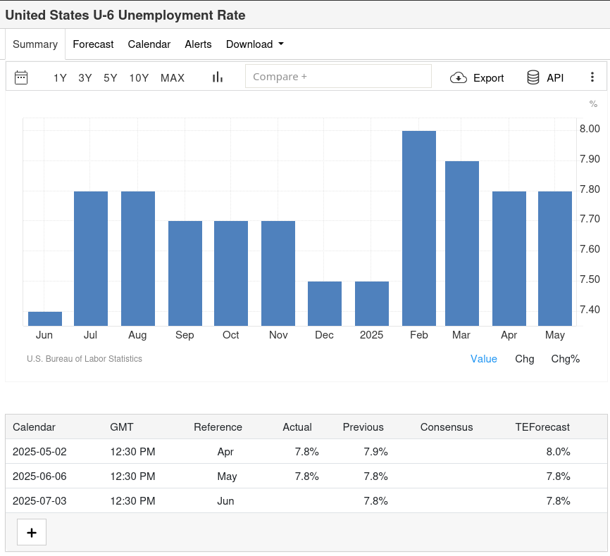 On June 6, 2025, the US unemployment rates were first released, and as we can see in the images, unemployment has remained the same, at 4.2% and 7.8%. These two indicators show unemployment in America: the first index shows full-time unemployment, while the U-6 index also includes those who have temporary work. The point of these indicators is that if they are above 4% and above 8%, respectively, it’s an indicator for the Federal Reserve that they should lower interest rates. However, the reduction doesn’t depend solely on these indicators. It also depends on other things, which I’ll explain below.