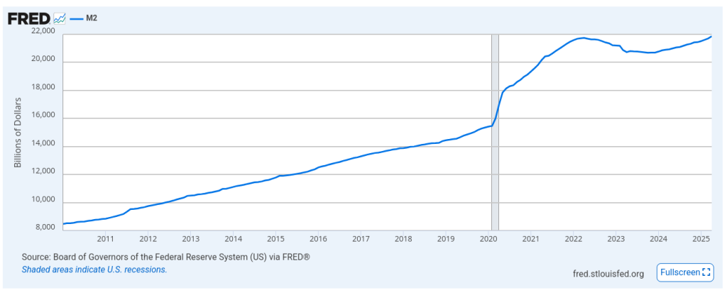 I also must address another very important factor, which is bond yields, which are very high. When bond yields are very high, there won’t be a reduction in benchmark interest rates. This means that no one is buying the loans that the US government wants to take out, and they have to offer a higher percentage of earnings for someone to buy them. You can see the bond yields and the M2 index below.