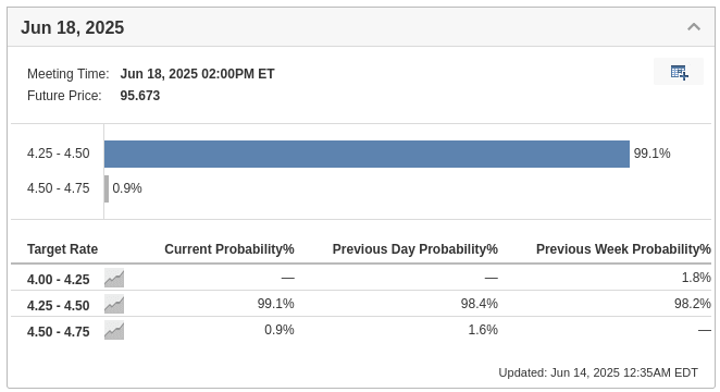 As you can see in the image below, there will be a Federal Reserve meeting on June 18th, and with 99% certainty, we won’t see a cut in the reference interest rates. In my opinion, when the rate cuts do begin, they will happen at a more aggressive pace in order to stimulate the U.S. economy as quickly as possible. It remains to be seen when that will actually start.