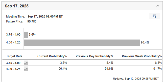 Their next meeting is on September 17th, and based on everything happening in the US, the question isn’t whether they’ll cut the interest rate, but by how much. As you can see in the images below, there’s a 96% certainty of a 0.25% cut, but there’s a 4% chance of a 0.50% cut. In my opinion, they should cut it more because the US has a debt it needs to manage, and the interest on that debt is too high with the current rate. They are also far behind Europe and other countries that started cutting their rates months ago.